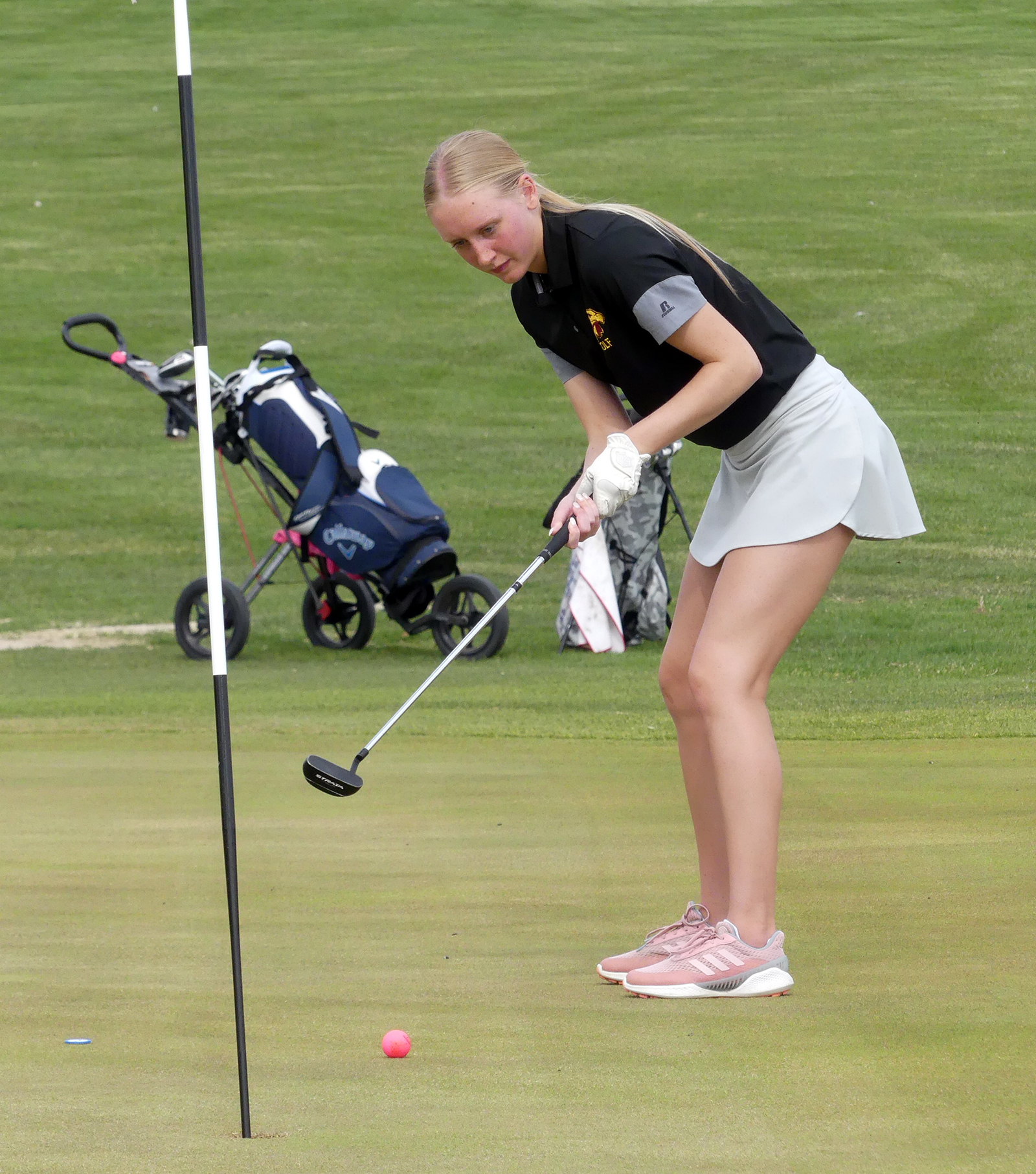 Elise Haack’s putt is on the way to the hole and the HMS senior was on the way to a round of 55 to help the Hawks defeat MMCRU and Harris-Lake Park.
