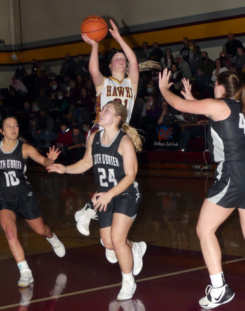 HMS missed multiple scoring chances early and fell behind 22-7 midway through the second quarter. The Hawks began to find the range and the teams entered intermission with HMS trailing 27-16. More of the same got the Hawks within a single point on two occasions late in the third quarter, which ended with South O’Brien in front 36-32. In the final frame the Hawks made only two baskets and were just 7-of-18 at the free throw line, allowing the Wolverines to pull away.