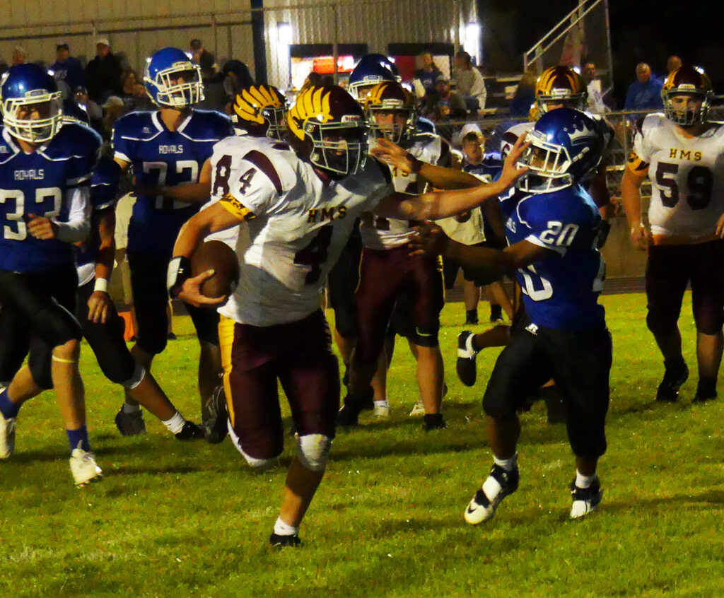 The Hawks rushed for 413 yards and gained another 31 yards through the air. The Royals were held to under 200 yards total offense. Much of that total came with defensive reserves in the game for HMS. In addition to the Groeneweg pick, James Gellerman and Ethan Wiersma each came away with an interception. Ebel returned a fumble 50 yards and Dodd executed a long punt return with both plays setting up touchdowns.
