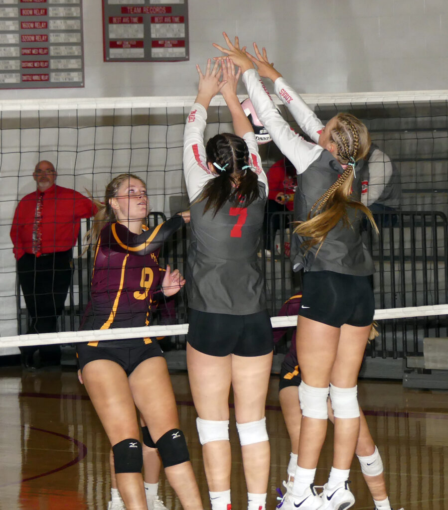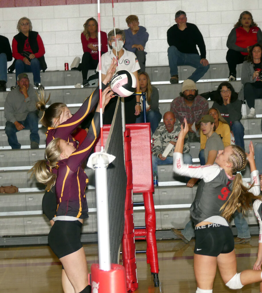 Emily Otto watches her attack power down through the block attempt of Sioux Central’s Alyse Terrell (7) and Preslie Peterson.