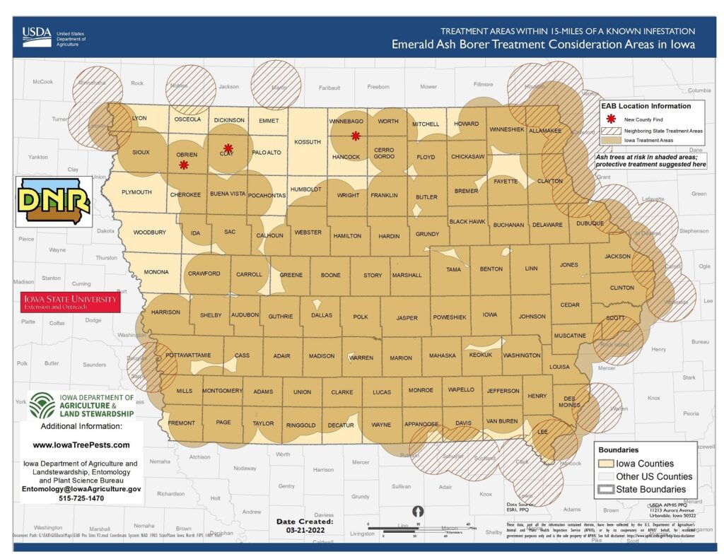 DES MOINES, Iowa (March 21, 2022) – Emerald ash borer (EAB) has been found in Clay, Hancock and O’Brien counties for the first time. The invasive, ash tree-killing insect from Asia has now been confirmed in all but 10 of Iowa’s 99 counties since its original detection in 2010.