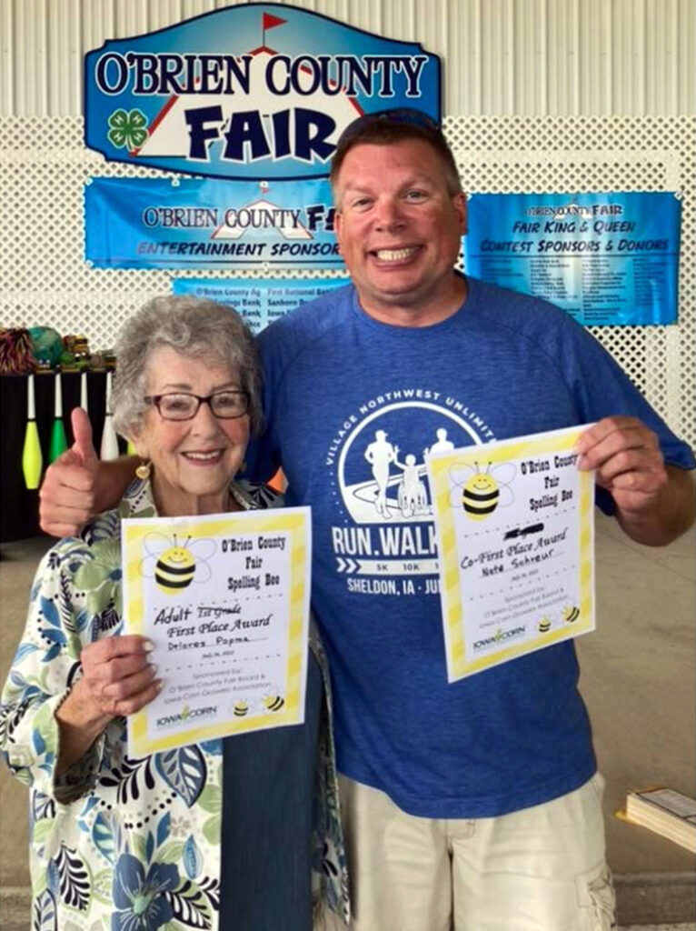 Delores Popma and Nate Schreur, both of Sanborn, were declared co-champions of the adult division at last week’s O’Brien County Fair Spelling Bee. Delores and Nate outlasted the rest of the competition to produce a head-to-head matchup. The competition continued for a number of rounds with both failing to correctly spell the word “fuchsia.”