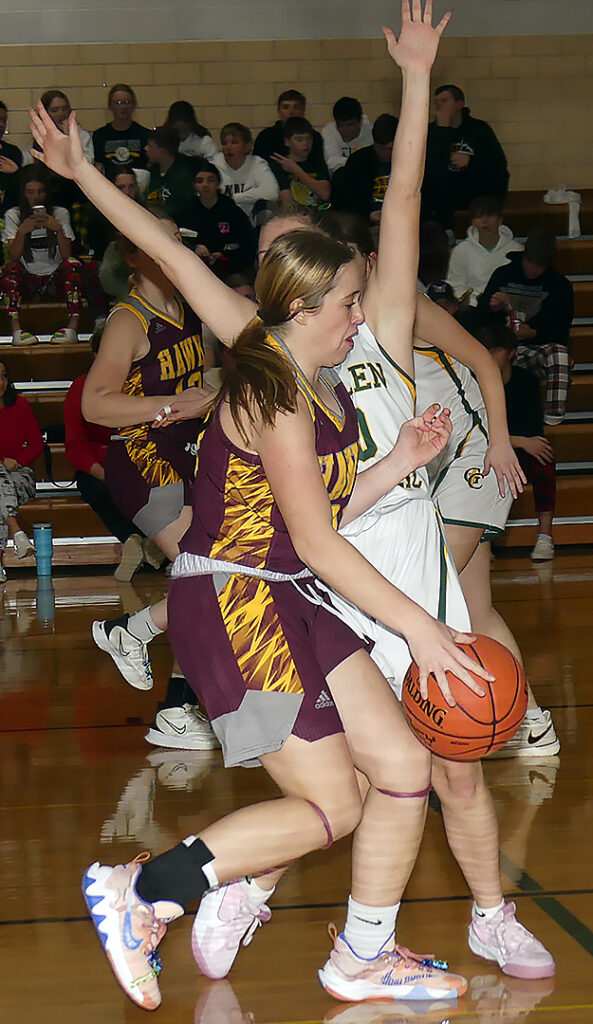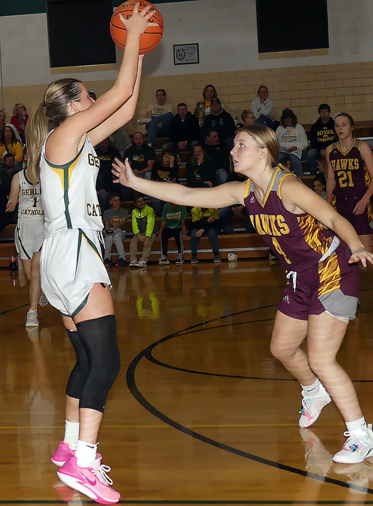 A successful inside game during the first half set Hartley-Melvin-Sanborn up for a 55-42 win over Gehlen Catholic December 15 at Le Mars. The Hawks led 28-17 at halftime in picking up their first War Eagle Conference win in three tries. HMS evened its season record at 4-4.
