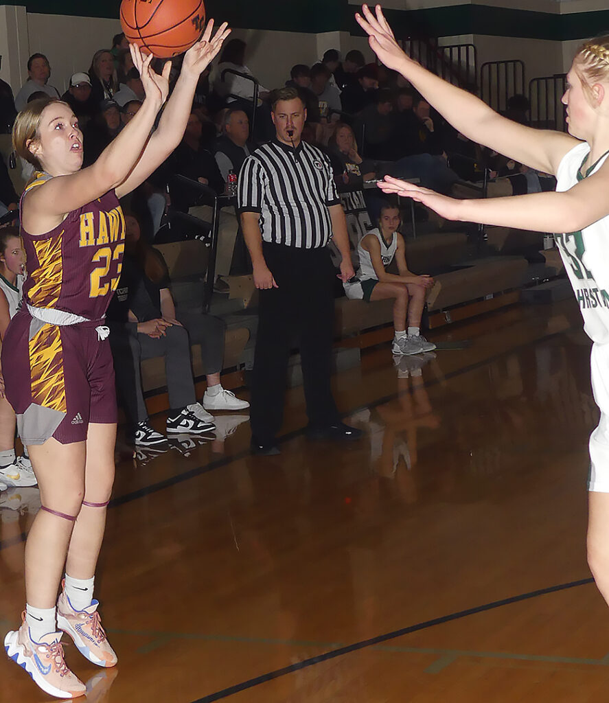 Kylee Schiphoff delivered six of those three-point baskets and finished with 25 points. Four treys were part of Gracie Knobloch’s 18-point night. Frankie Mohni added two more threes for her six points and Lindsey Van Es closed out the first half with a trey that drew HMS within five points at 32-27. Rounding out the Hawk scoring were Moriah Otto with seven points and Eliza Tewes with four.