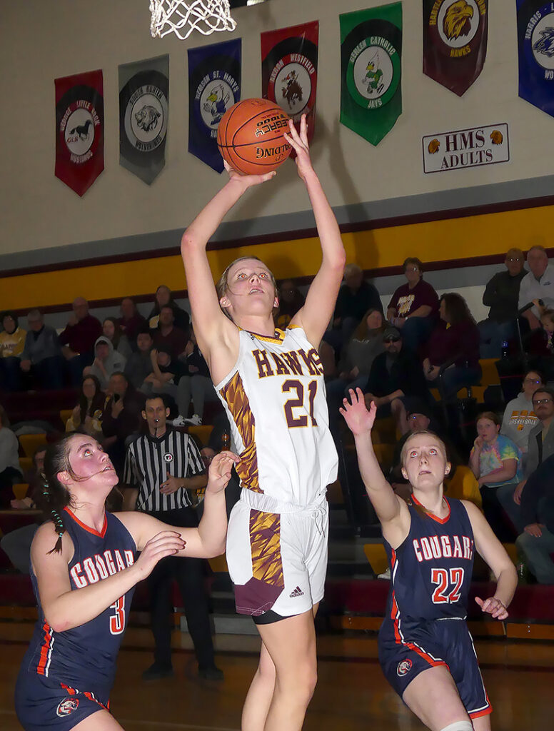 The 33 Hawk shots were 28 fewer than the number put up by the visitors. HMS finished with 16 baskets to shoot 49 percent. The Cougars managed only one bucket more to end up at 28 percent. Schiphoff and Mohni each nailed a three-pointer while Manson-NW Webster went 0-for-11 from beyond the arc. At the free throw line the home team was 10-of-16 and the Cougars 12-of-21.