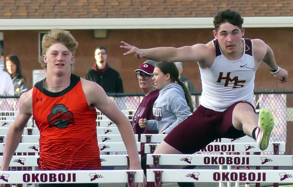 Following a week absent from competition due to a pair of meet cancellations, the Hartley-Melvin-Sanborn boys were back on the track (and at the adjacent field events) for the Okoboji Relays conducted April 22 at Milford. HMS was sixth in the team standings, scoring 53 points. Spirit Lake amassed 196 points to take first place over Okoboji and its 170 points.