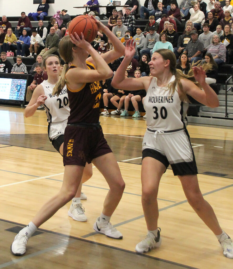 In the spirit of neighboring school districts getting together on the basketball court, Hartley-Melvin-Sanborn decided to hold a block party. The Hawks rejected 17 South O’Brien shots and turned away the Wolverines 51-41 December 17 at Paullina. The victory boosted HMS to 2-0 in the War Eagle Conference and 6-2 overall.