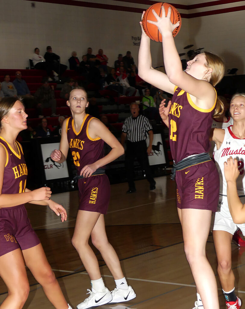 Lindsey Haken was just too much for Hartley-Melvin-Sanborn. The George-Little Rock junior scored 27 points, grabbed 12 rebounds, made nine steals and blocked two shots to lead the Mustangs to a 50-45 win over HMS January 7 at George. The Hawks, who fell to 7-4 overall, had won their previous three War Eagle Conference contests.