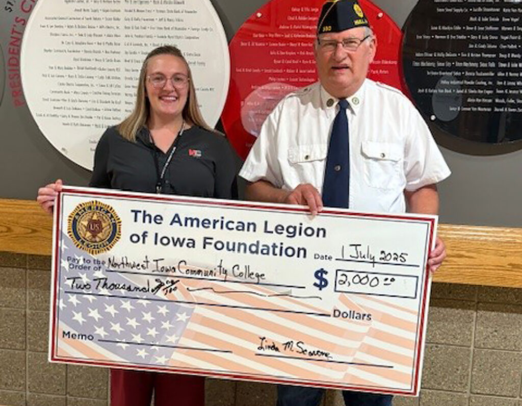 The Northwest Iowa Community College Foundation recently received a grant from the American Legion of Iowa Foundation for two $1,000 scholarships. These funds are to be awarded this fall to NCC students who are also veterans. On Wednesday, July 2, Charles Brunsting of the American Legion of Iowa, was on campus to present the check to Morgan Granstra from NCC’s Foundation. The American Legion Foundation was incorporated in 1978 and its purpose is to provide financial assistance to promote Americanism, youth programs, veterans rehabilitation and community service in the state of Iowa. For more information on the American Legion of Iowa Foundation Scholarship offered through the NCC Foundation, contact the Foundation Office at 800-352-4907.