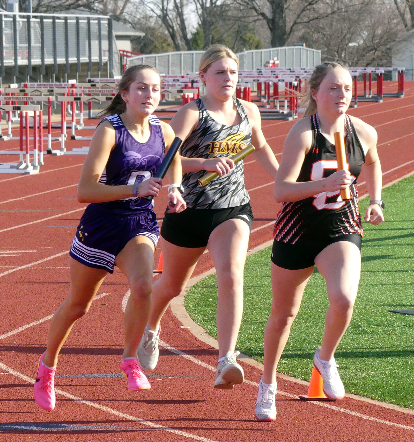 Published April 18, 2023 at 1600 × 1705 in Kamryn Ebel is flanked by two competing runners at the start of the Unity Co-ed Invite 4×800 relay.