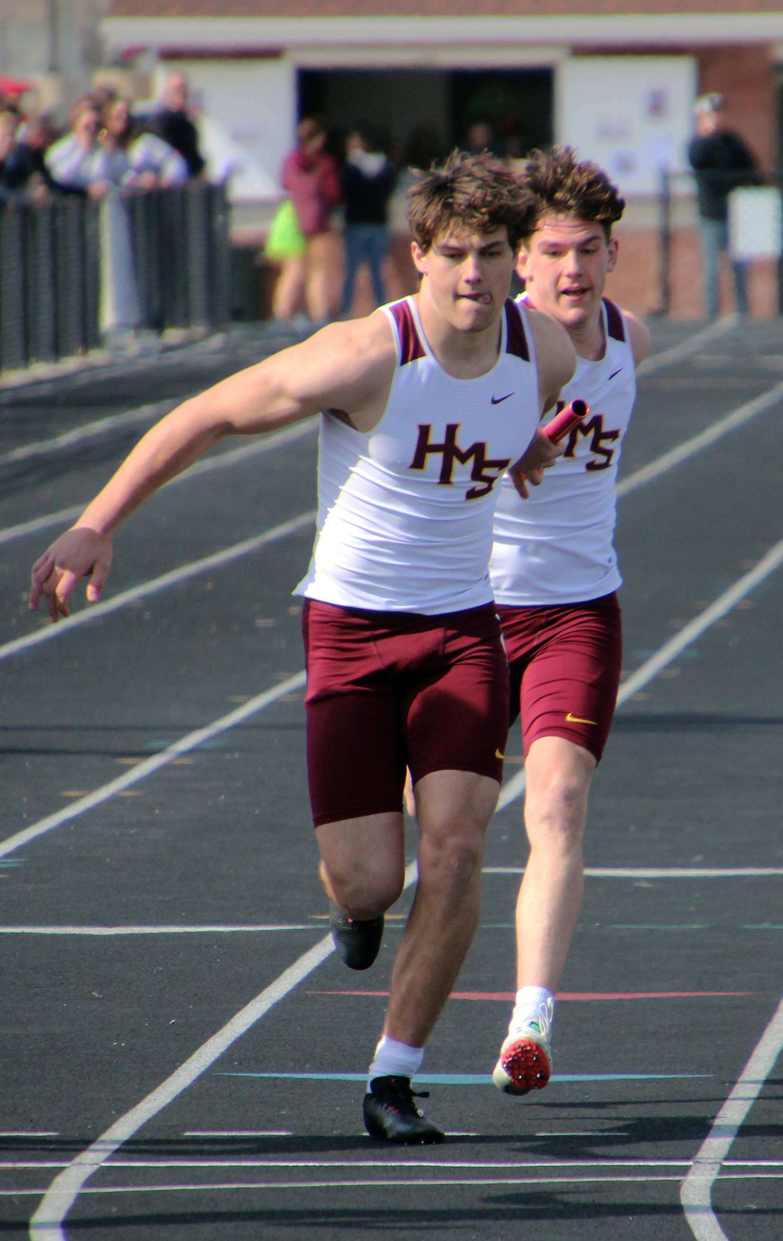 Kooper Ebel reaches back to take the baton from James Gellerman during the Okoboji Relays sprint medley relay.