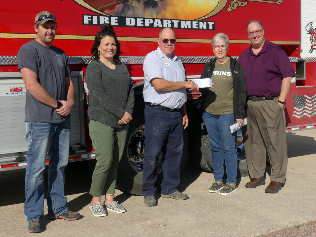 Presenting the check to Sanborn Fire Chief Randy Lyman is Leilla Reitsma of Prins Insurance. On the far left, also representing the Fire Department, is Cody Stange. Other Prins Insurance team members pictured are Jenna Boyd and Bruce Mosier.